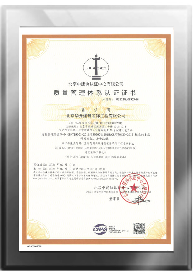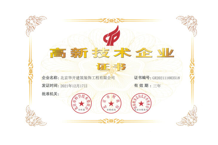 北京华开建筑装饰工程有限公司成立于1992年,注册资金10060万元。其中,一级建造师和二级建造师共70人,中高级职称的员工超过60人;跻身中国建筑装饰行业综合数据统计排名前50;华开具有装饰装修一级,幕墙与智能化二级,总承包三级以及设计专项甲级等众多企业资质。荣获“北京市优秀建筑装饰企业”和“北京市高新技术企业”称号,并拥有多项发明专利。华开所获奖项不胜枚举,包括多项鲁班奖、长城杯、国家级优质工程和省部级优质工程奖等荣誉;
