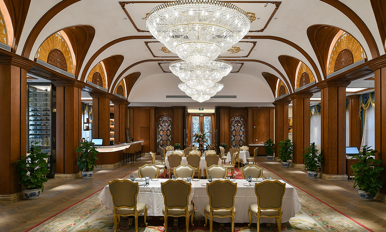 华开项目团队根据俄罗斯餐厅原有建筑条件,延续俄式教堂浑圆饱满的穹顶、拱窗等特点,通过运用教堂玻璃、立粉彩绘等传统工艺材料,营造一个庄重具有仪式感的俄式餐厅,投入使用后成为中俄两国领导人的重要会晤地点。